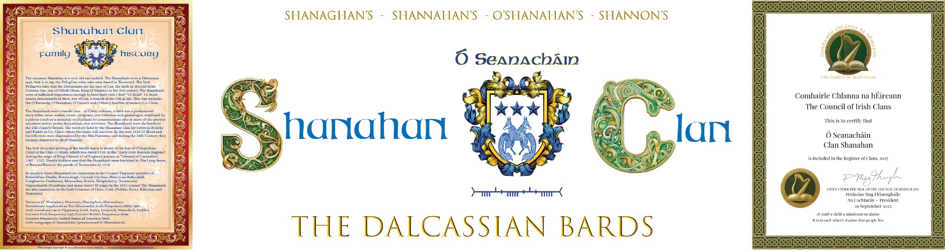The Shanahan's were a bardic clan - in Celtic cultures, a bard was a professional story teller, verse-maker, music composer, oral historian and genealogist, employed by a patron (such as a monarch or chieftain) to commemorate one or more of the patron's ancestors and to praise the patron's own activities. The Shanahan's were the bards to the Dál cGais/O'Brien's.